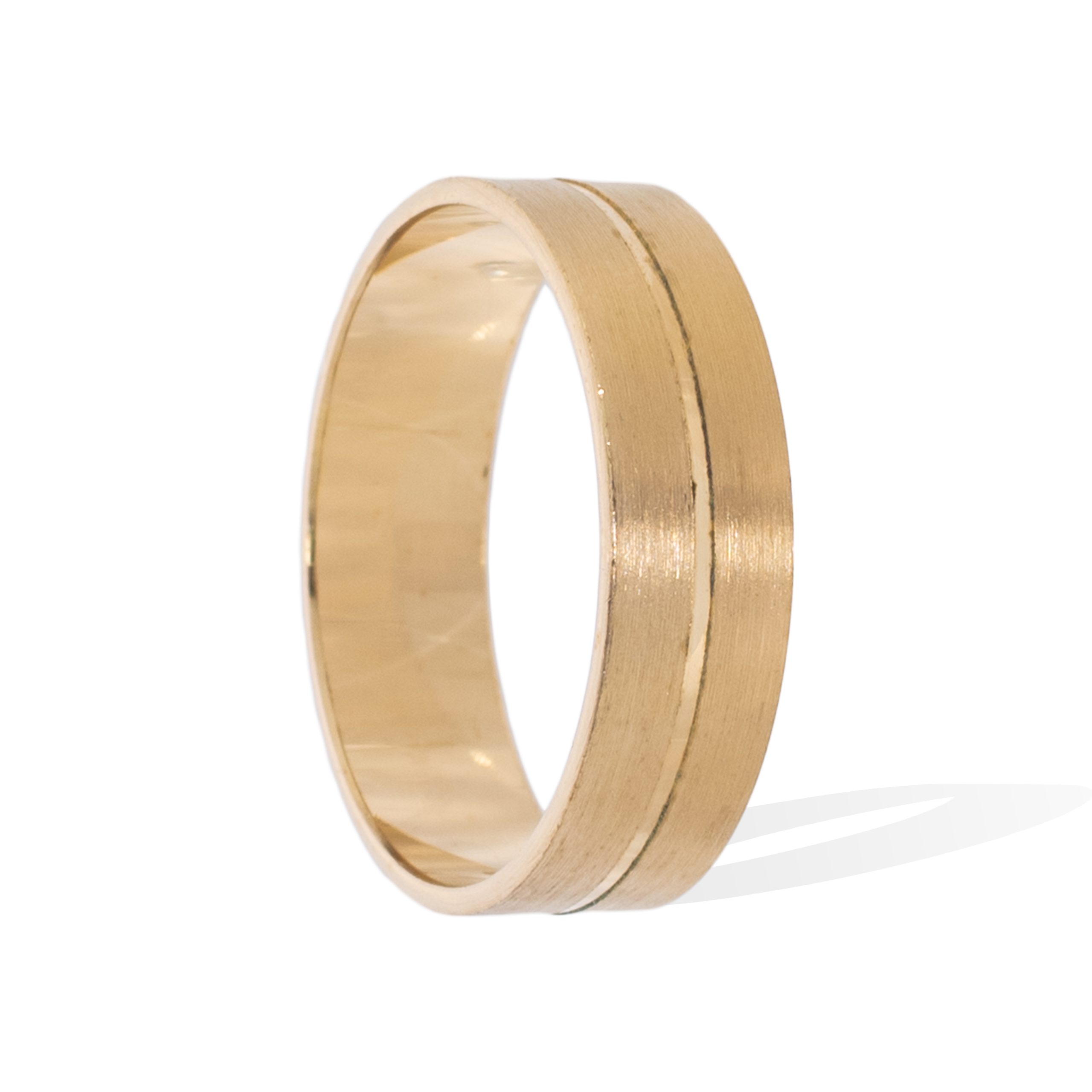 Argolla de matrimonio de oro amarillo 14 kts, de sección plana tiene un acabado satinado y una fina banda central brillante rebajada de acabado brillante y con el interior plano. 6mm de grosor